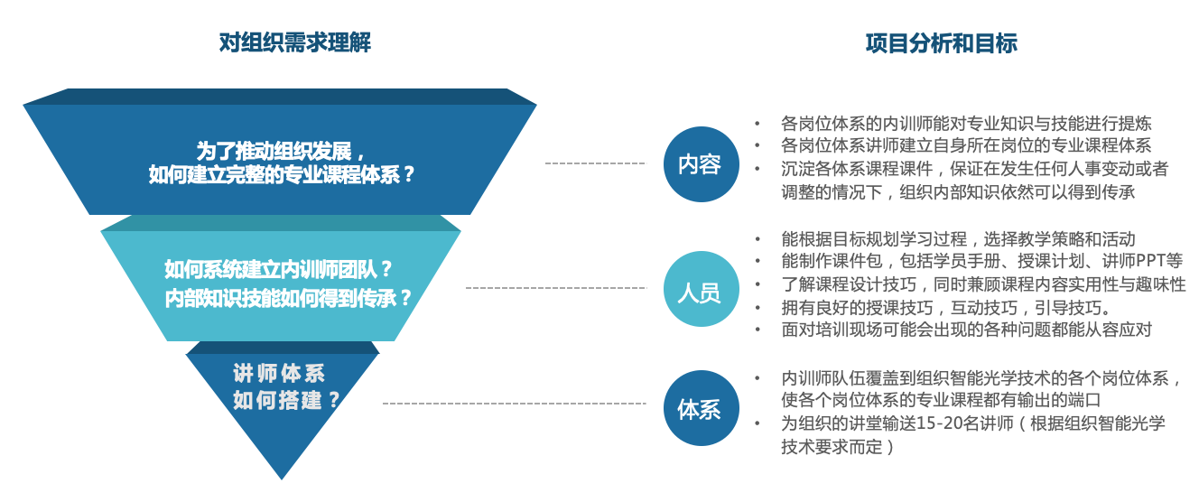 “蒲公英计划”培训师培训训练营发表时间:2022-03-15 12:54 2018-2019年,作(zuo)(zuo)为(wei)国内某领先的(de)光(guang)学(xue)产品制造企(qi)业,历来重视员工(gong)的(de)教育培训工(gong)作(zuo)(zuo)。随着培训工(gong)作(zuo)(zuo)的(de)不(bu)断深化,组织(zhi)希望能(neng)够做为(wei)集团的(de)带领者,率(lv)先做好内训体系(xi)搭建的(de)工(gong)作(zuo)(zuo)。同时,在本(ben)次(ci)项目中,对于现阶段(duan)尖(jian)端技术,进(jin)行课程开发。 深(shen)度沟通(tong) 制定项目(mu)方案 项(xiang)目(mu)前(qian)(qian)期,项(xiang)目(mu)组(zu)针对组(zu)织目(mu)前(qian)(qian)主要需求进(jin)(jin)行(xing)梳理,从三个层面进(jin)(jin)行(xing)目(mu)标分析,分别是内(nei)容、人员、体系。内(nei)容层面上,为了推动组织(zhi)发展,如何(he)建立(li)完整的专业课程体系?人(ren)员的(de)层面上,如何(he)系统建立内训师(shi)团(tuan)队,内部知识技能(neng)如(ru)何得到传承?从讲师体系的层面上讲师体(ti)系如何搭建?