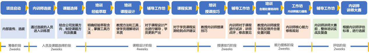 TTT学习地图 根据前期达成三个层面的需求(qiu)理解,我(wo)们进(jin)行了学(xue)习地图的构建:先针对课(ke)程体系(xi)进(jin)行布局,其次(ci)对于课(ke)程内(nei)容(rong)首次(ci)/再度(du)开(kai)、课(ke)程体系(xi)构建完成后,经过测评和面试,挑(tiao)选(xuan)出(chu)来团(tuan)队内(nei)部(bu)合适的内(nei)训师,进(jin)行讲师授(shou)课(ke)技巧的学(xue)习。