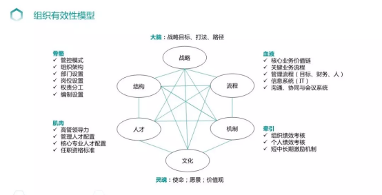 • 战略-大脑:战略目标、打法、路径。 简单来说组织发展的核心,一定是要围绕着公司的战略和业务,它是这个组织的大脑,是方向。 • 文化-灵魂:使命、愿景、价值观 使一群人在解决问题的时候思想统一、上下同欲。 • 结构-骨骼:管控模式、组织架构、部门设置、岗位设置、权责分工等 保证资源和信息流通的有序性,并通过这种有序性,稳定和提升这个组织所共同使用的资源。 • 流程-血液:核心业务价值链、关键业务流程、管理流程、信息系统等 有时候会把结构和流程认为是同一件事情。 • 人才-肌肉:高管领导力、管理人才配置、核心专业人才配置等 基于企业的战略目标,再来思考我们需要什么样的组织架构来去承载我的战略。架构确定清楚了之后再来思考人才到底如何来去发展,战略决定架构决定人才。 •机制-牵引:考核制度、激励机制 做事时候的奖惩机制。 生命周期 对于HR而言除了上面的组织发展全景图外,我们也要懂业务的发展阶段,不同的发展阶段组织管控的重视是有差异的。