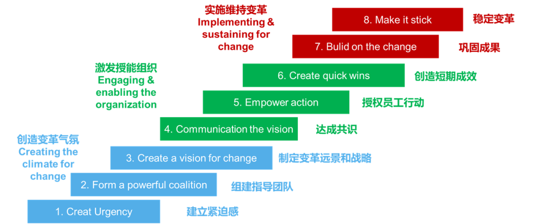 人(ren)口结(jie)构的(de)变化属(shu)于(yu)一个(ge)客观的(de)外部(bu)因(yin)素,但因(yin)为(wei)人(ren)口结(jie)构的(de)变化,那对(dui)(dui)于(yu)企业(ye)对(dui)(dui)于(yu)HR来说意味着什么呢(ni)? 劳动(dong)人口基(ji)(ji)数的(de)(de)下降,劳动(dong)力(li)素质的(de)(de)改(gai)变(bian),岗(gang)位与劳动(dong)力(li)供需比的(de)(de)改(gai)变(bian),那是否意味着招聘的(de)(de)难度(du)会有上升。尤其(qi)对于(yu)生(sheng)产型企业(ye)来说(shuo),基(ji)(ji)础劳动(dong)力(li)的(de)(de)减弱(ruo),是否会生(sheng)产速度(du)、生(sheng)产效(xiao)益造成影响(xiang)。 就这么一个很客观的(de)外部因素,最后会造成企(qi)业内部招(zhao)聘政策的(de)改(gai)变(bian)(bian)、企(qi)业生(sheng)产(chan)(chan)(chan)规模的(de)改(gai)变(bian)(bian),最终导致(zhi)企(qi)业生(sheng)产(chan)(chan)(chan)形式的(de)改(gai)变(bian)(bian)(由密(mi)集劳(lao)动力生(sheng)产(chan)(chan)(chan)型转变(bian)(bian)为高(gao)科技生(sheng)产(chan)(chan)(chan)型)。 02 科特变革八步法 当(dang)我们谈到“变革(ge)”时(shi),科特的变革(ge)8步(bu)法始终是经典的存在,这八步(bu)法可以助您清(qing)晰的了(le)解(jie)实施企(qi)业变革(ge)的关键环节(jie),提供一个系统性(xing)的思路(lu),提高企(qi)业变革(ge)的成功概(gai)率。