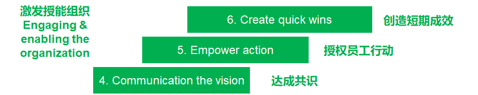 ● 第一阶段关键工作: -识别(bie)公司面(mian)对(dui)的潜在威胁,通过场景描述来帮助(zhu)员工理解不变革(ge)会有(you)怎样的后果 -与员(yuan)工坦诚地沟通,调动大家的积极(ji)性(xing)充(chong)分讨论和思(si)考 -从(cong)客户、外部利益相关(guan)人、行业相关(guan)人士那(nei)里获取(qu)支持(chi),增强说服力 ● 第二阶段关键工作: -在组织中(zhong)找到(dao)真正的(de)“领导者”以及核(he)心的(de)利(li)益相(xiang)关(guan)人 -与这些关(guan)键人士沟通,尽可能获(huo)得他们的支持(chi)及“真心的”承诺 -组建(jian)变革领导团队(dui)(dui),促进团队(dui)(dui)凝聚力的形成 -检核团队构成,确保团队成员来(lai)自不(bu)同的(de)部门,且覆盖了不(bu)同的(de)职位层级 ● 第三(san)阶(jie)段关键工作: -确定变(bian)(bian)革项目的核心价值,形成(cheng)变(bian)(bian)革的愿景描述 -确保变革愿景(jing)能在五分钟之内清晰陈述(shu)